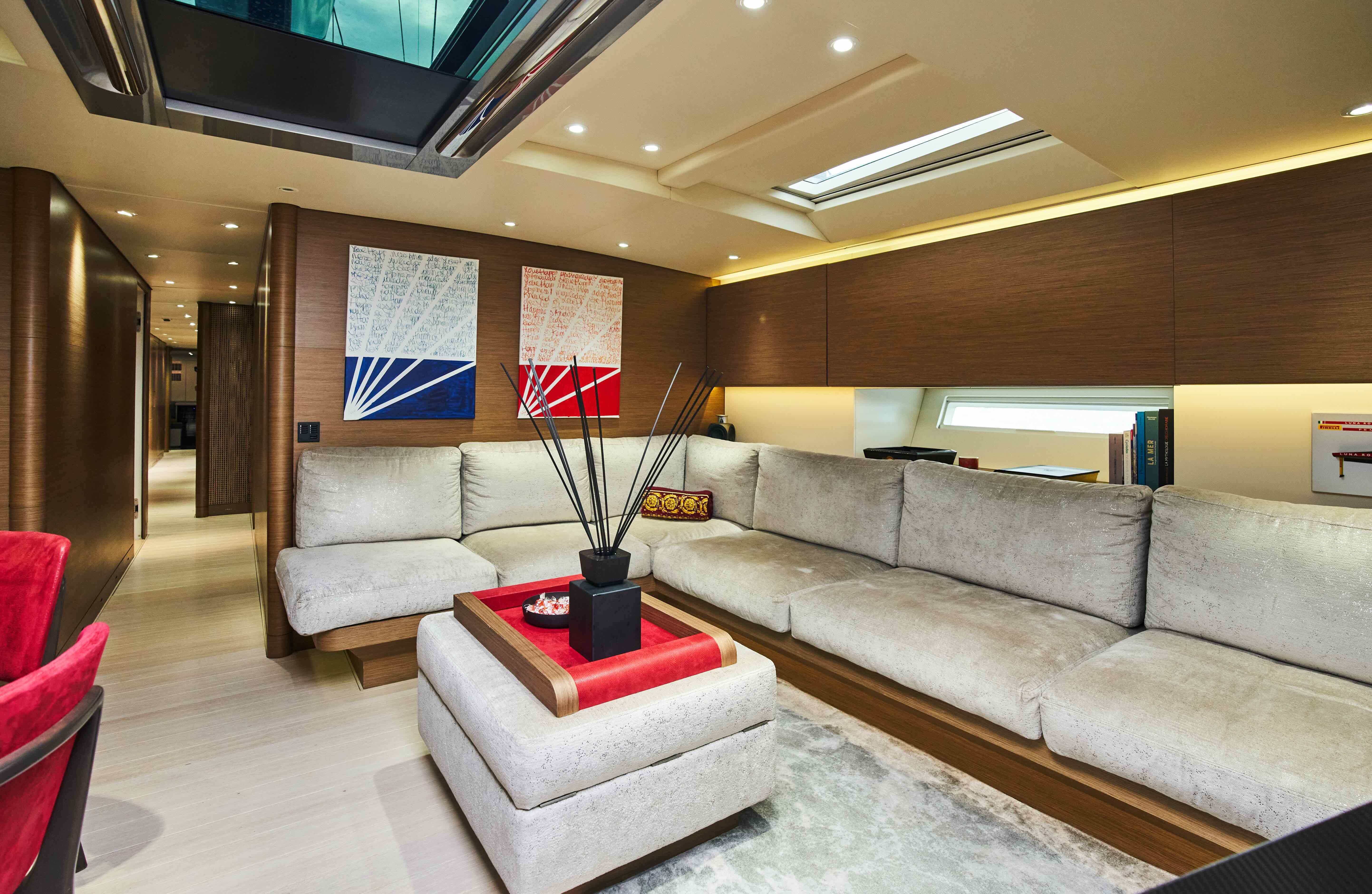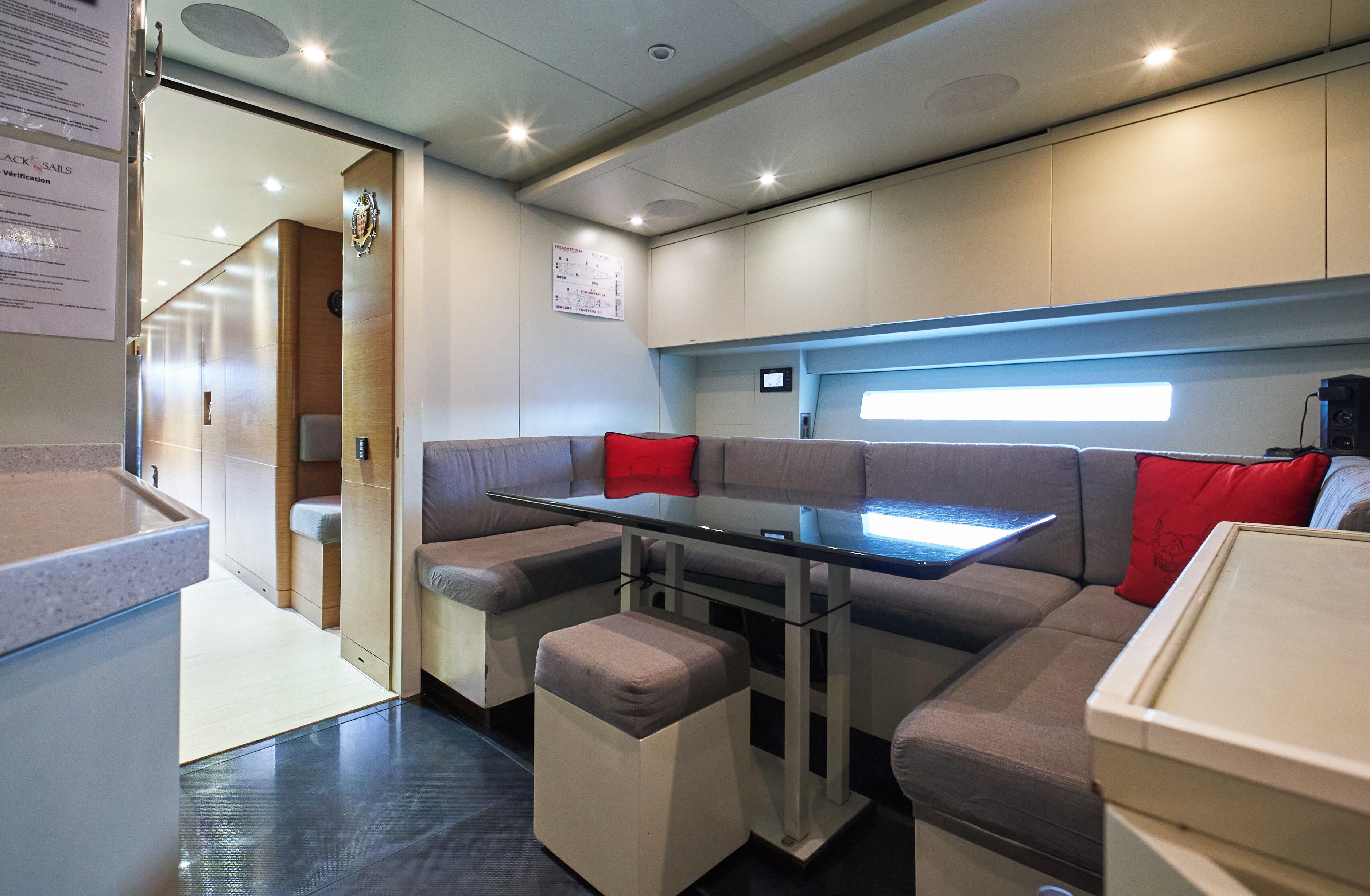 main salon has the lounge area to starboard and a formal dining table to port,
